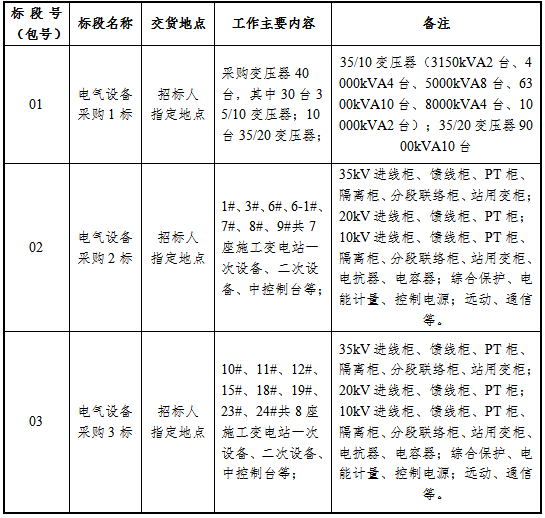 本次招標共劃分3個電氣設備采購標段,具體工作范圍、供貨范圍等以“第五章 供貨要求”內容為準。主要采購范圍見下表: