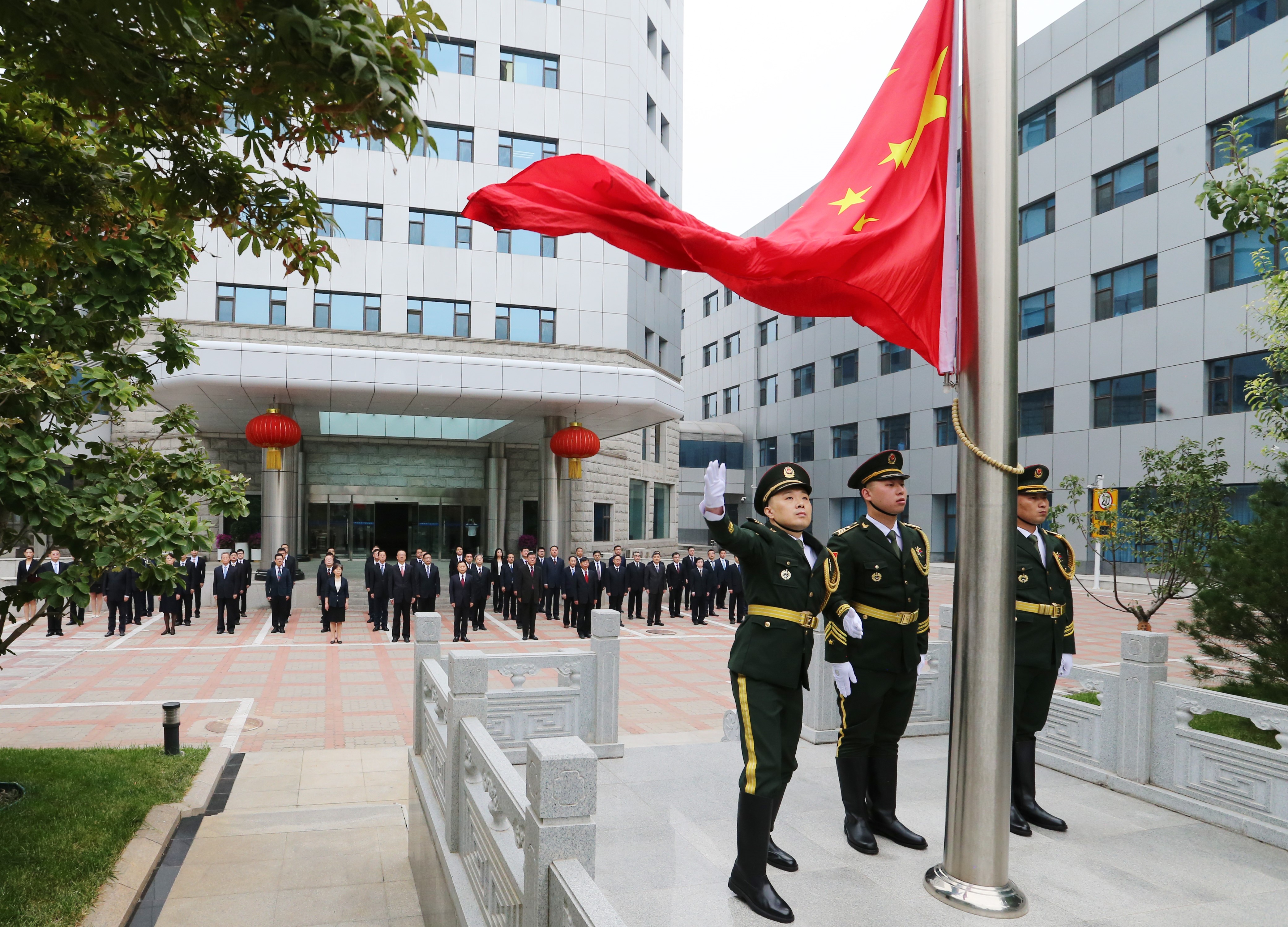 上午8時(shí)整,升國(guó)旗儀式正式開始。3名升旗手昂首挺胸、精神抖擻,邁著鏗鏘有力的步伐護(hù)衛(wèi)國(guó)旗走向升旗臺(tái)。伴隨著莊嚴(yán)嘹亮的《義勇軍進(jìn)行曲》,鮮艷的五星紅旗冉冉升起,在場(chǎng)干部職工整齊列隊(duì)、肅立致敬、高唱國(guó)歌,向國(guó)旗行注目禮。
